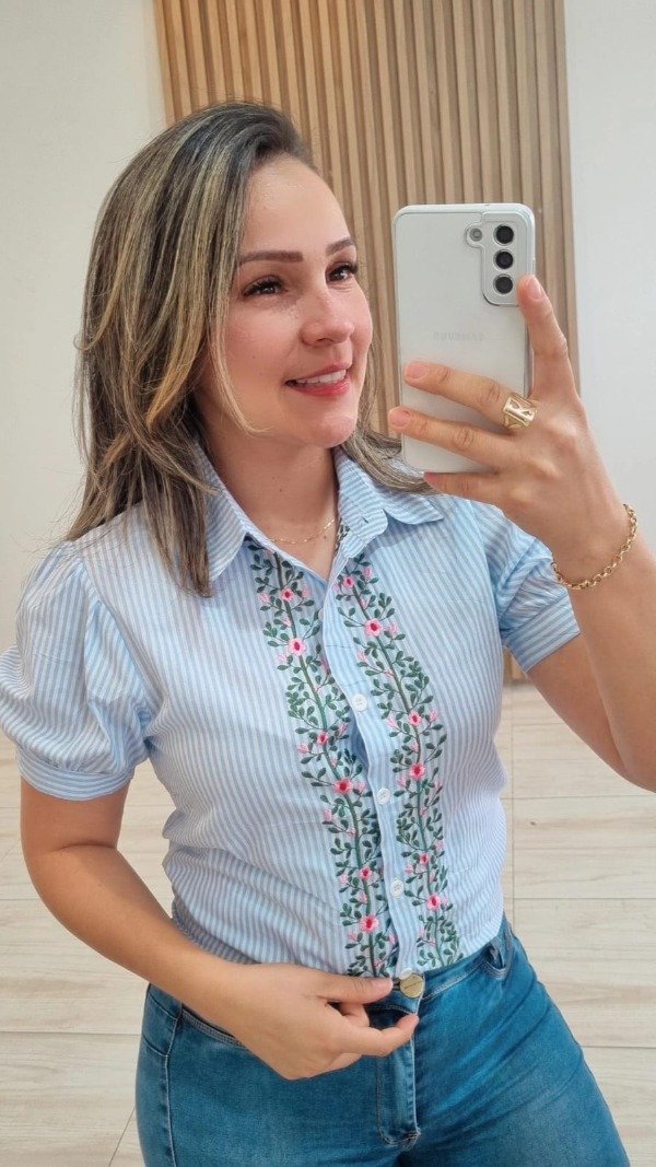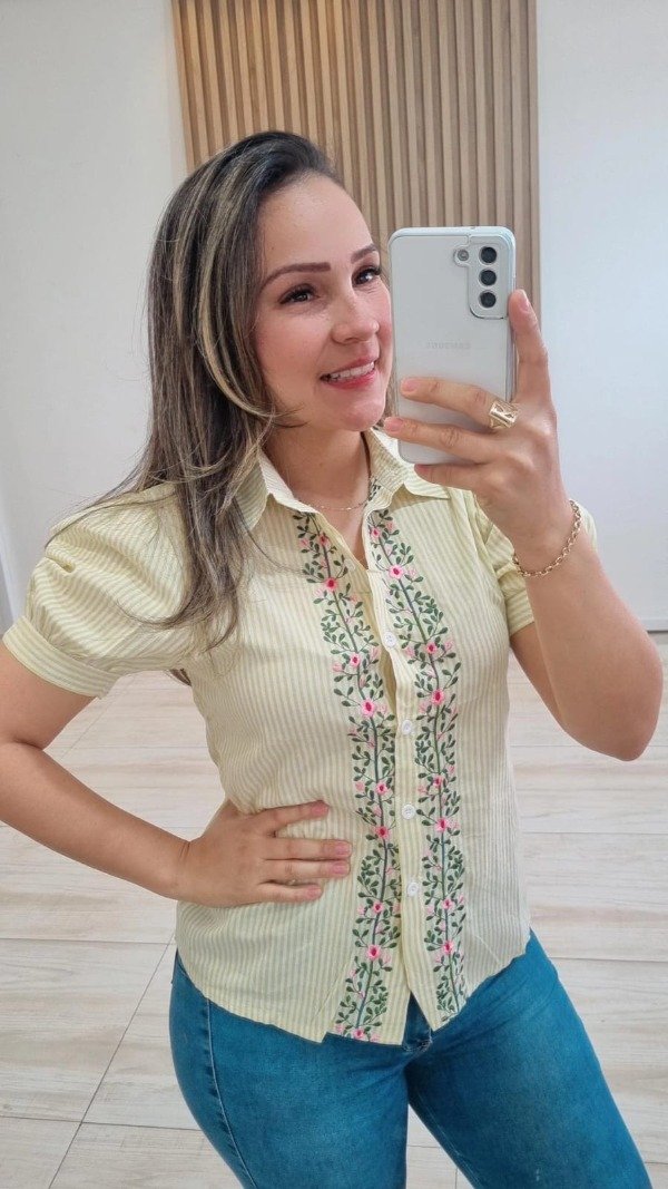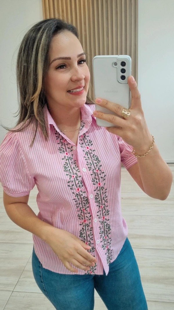 Camisa manga corta rayas bordada florcotas