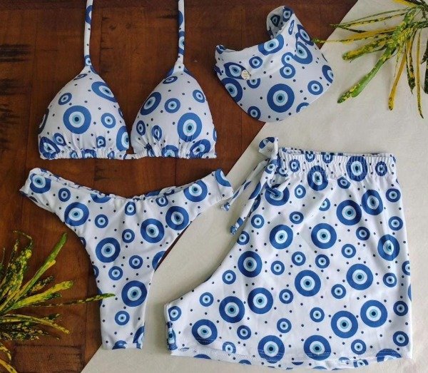 Conjunto 3 piezas importado corpiño triangulo less y short ojo turco